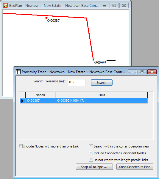 Each node displayed in the grid on the Proximity Trace View is snapped to its adjacent pipe at the nearest point on the pipe. When using OK All, the node will be snapped to the first pipe in the Split Existing Link list.