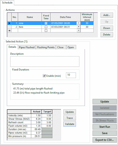 The lowest shear stress through pipes when flushing is carried out is reported as Actual shear stress.