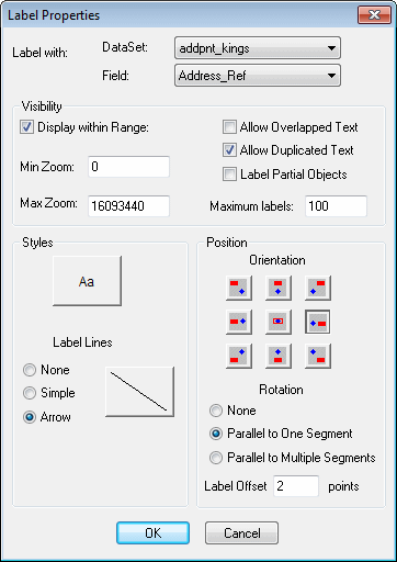 Use this dialog to set up label styles on imported MapInfo MapX Layers.