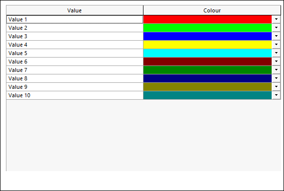 Clicking the drop control to the right of a colour displays a colour palette, from which a new colour can be selected. If you click the Custom button, the standard Windows Colour dialog is displayed, from which a new colour can be generated.