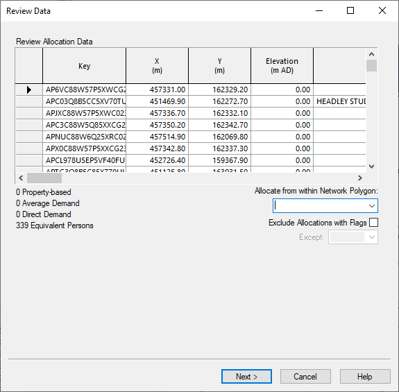 InfoWorks reads through the points that can be used for allocation in future steps, and displays them in an editable grid.