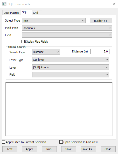If you are familiar with SQL queries, you can type in a query manually (using the Field Type and the Field drop-down lists to insert the fields you need). Details of the SQL statements allowed in InfoWorks WS Pro can be found in the SQL syntax topic.