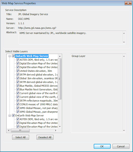 Use this dialog to view the display properties for the selected Web Map Service (WMS) layer. Visibility of layers can be edited in this dialog. Other parameters, such as the magnification range through which the layer is visible are set on the Layer Control dialog.