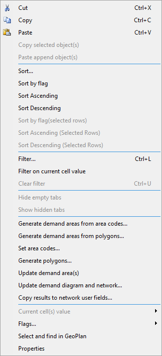 Right click the appropriate row of data to display the context menu. To apply a menu item to more than one row, select several rows and then right click. Properties cannot be displayed for more than one row at a time. If there are rows selected, properties will be displayed for the row containing the current cell.