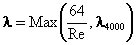 For Re <= 2000, the friction factor is the maximum of the Hagen-Poiseuille formula for laminar flow and the constant value above with a maximum cut-off value of 8 for Re<= 8.