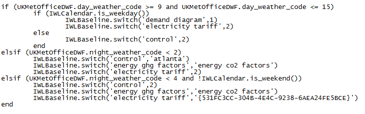 Ruby scripts are written to define when switch objects are to be used based on weather feed data and date.