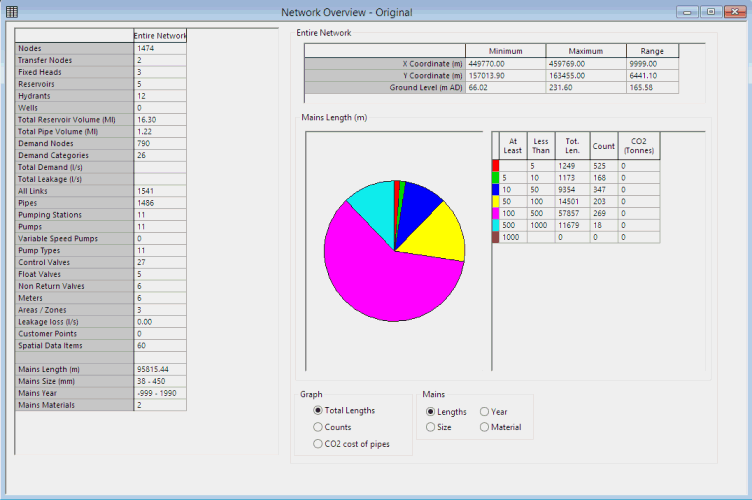 The left hand side of the view contains a summary of the entire network. If there is a current selection, an additional column is added containing a summary of the objects within the polygon. If a polygon is currently selected, the additional column will display a summary of the objects within the polygon.