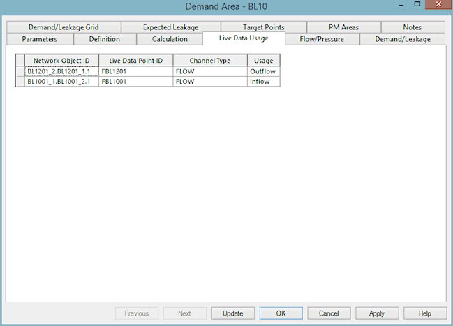 The Demand Area Live Data Usage Page is used to view the linked Live Data in the Demand Area. The Live Data Usage Grid shows the Live Data ID, the network object that the Live Data is linked to, the type of Live Data and how the Live Data is used in the demand calculation.