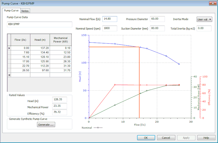 A pump curve is generated using a pump head (rated head) and nominal flow specified by the user and assuming an efficiency of 80% at the pump duty point. A ten point curve is created based around the duty point using multiplying factors from tables for a typical curve.