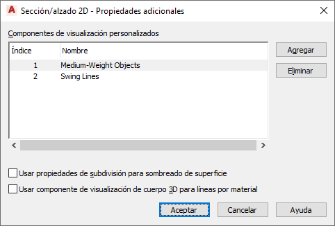 - Si ha desmarcado la opción Usar propiedades de subdivisión para sombreado de superficie, la visualización se controlará con la propiedad Por material del componente Líneas de sombreado de superficie. Para cambiar este parámetro, pulse el valor (*NINGUNO*) de Componente de visualización, seleccione el componente Líneas de sombreado de superficie y, a continuación, elija un valor distinto para Por material.