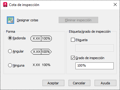 El valor se expresa como porcentaje y el rango válido es de 0 a 100. El grado de inspección se muestra en la sección derecha de la cota de inspección al activar la casilla de selección Grado de inspección.