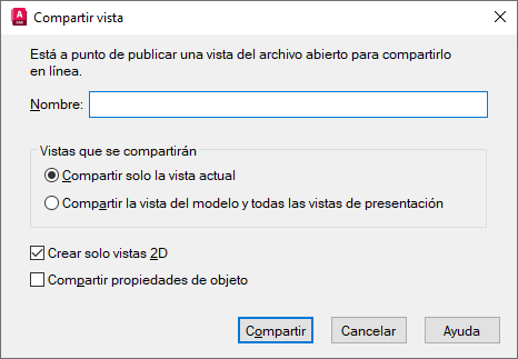 Permite asignar un nombre a la vista compartida. El nombre puede tener hasta 255 caracteres e incluir letras, números, espacios en blanco y cualquier carácter especial que no se utilice en el sistema operativo ni en el programa para otros fines.