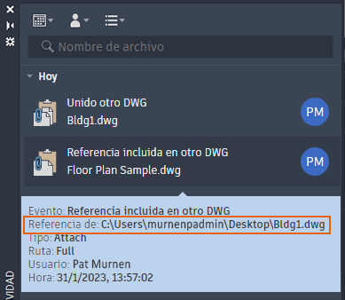 También se incluye en los eventos de información de actividad el momento en el que se ha enlazado un dibujo como una refX a otro. El nombre del dibujo que hace referencia al dibujo actual aparece en los detalles del evento.