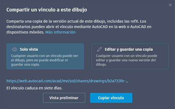 Cualquier usuario con el vínculo puede acceder al dibujo en un navegador web o en la aplicación para dispositivos móviles. El vínculo caduca siete días después de su creación. Puede elegir entre dos niveles de permiso para los destinatarios: Solo vista y Editar y guardar una copia.
