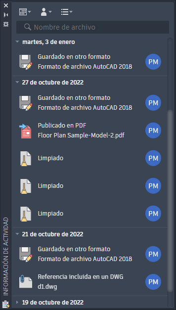 Muestra la paleta Información de actividad para ver los eventos del dibujo actual. Los eventos se pueden filtrar mediante los filtros de calendario, usuario, evento o búsqueda.