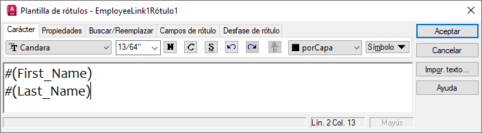 Aplica un estilo de texto al rótulo. El estilo actual se guarda en la variable de sistema TEXTSTYLE. El formato de carácter para el tipo de letra, la altura y los atributos negrita y cursiva se ignora si se aplica un estilo nuevo a una plantilla de rótulo ya existente. Los atributos de apilación, subrayado y color se mantienen en los caracteres en los que se aplica un nuevo estilo. No se aplican estilos con efectos cabeza abajo o hacia la izquierda. Si se aplica un estilo definido con un efecto vertical a un tipo de letra SHX, el texto se muestra en sentido horizontal en el cuadro de diálogo Plantilla de rótulos.