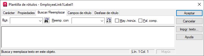 Busca cadenas de texto especificadas en la plantilla de rótulo y las reemplaza con texto nuevo.
