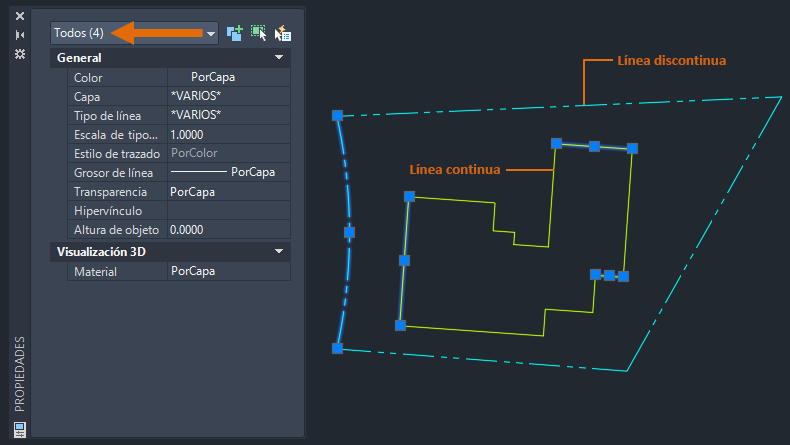 Ahora, al seleccionar la línea continua, esta se muestra en la paleta Propiedades como un objeto de polilínea.