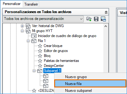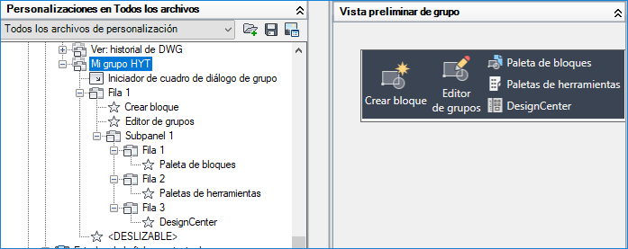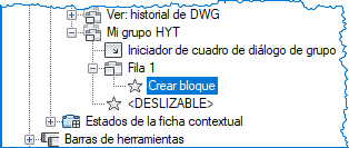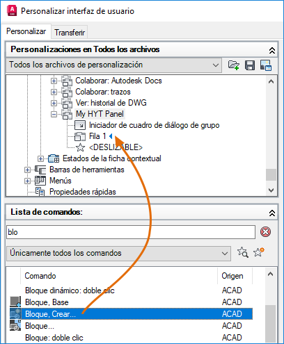 En el cuadro de texto Buscar lista de comandos del panel Lista de comandos, escriba bloque. Seleccione Crear bloque (comando BLOQUE) y arrástrelo a la fila 1 debajo de Mi grupo HYT.