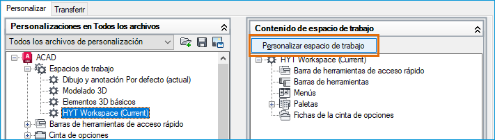 Seleccione el espacio de trabajo actual y haga clic en Personalizar espacio de trabajo en el grupo Contenido de espacio de trabajo.