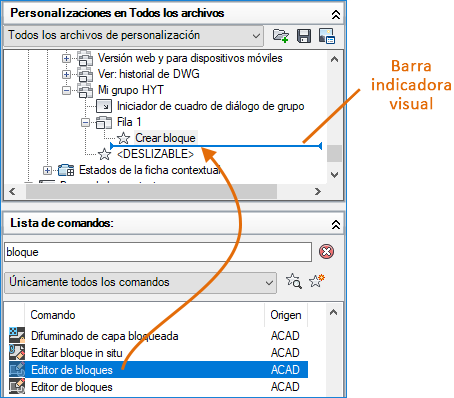 Mediante el resultado de búsqueda "bloque", seleccione el editor de bloques (comando EDITARBLOQUE) y arrástrelo a la fila 1, debajo de Crear bloque. Utilice la barra indicadora gráfica para especificar la posición del comando.