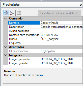 La tilde (~) y el signo de exclamación seguidos de un punto (!.) se incluyen al principio del rótulo del comando Copiar vínculo de la propiedad Nombre del panel Propiedades. A continuación, se muestra el resultado de marcar y atenuar el comando Copiar vínculo en el menú Editar.