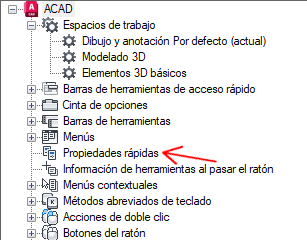 - En la ficha Personalizar, en el panel Personalizaciones en <nombre de archivo>, haga clic con el botón derecho en Propiedades rápidas.