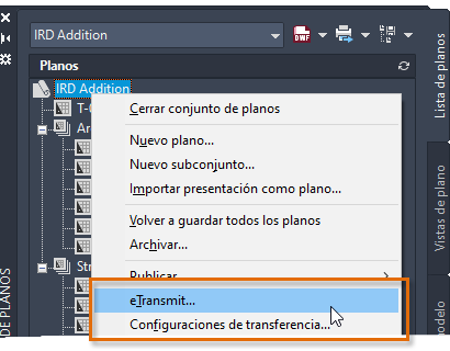 Si el dibujo actual forma parte de un conjunto de planos, los datos del conjunto de planos (DST) y sus archivos de soporte también se incluyen en el paquete de transferencia. Para crear un paquete de transferencia de los archivos de un conjunto de planos, se recomienda utilizar la función eTransmit del Administrador de conjuntos de planos en lugar del comando ETRANSMIT. Haga clic con el botón derecho en el nodo del conjunto de planos en el Administrador de conjuntos de planos y elija eTransmit para empaquetar todos los archivos de dibujo y soporte del conjunto de planos. Un conjunto de planos puede contener también configuraciones de transferencia, lo que facilita el uso compartido de los parámetros de transferencia con otros usuarios que trabajen en un proyecto.