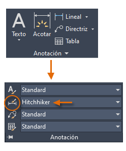 El nombre del estilo de cota actual, en este caso, Hitchhiker, también se muestra en la lista desplegable del grupo Anotación.