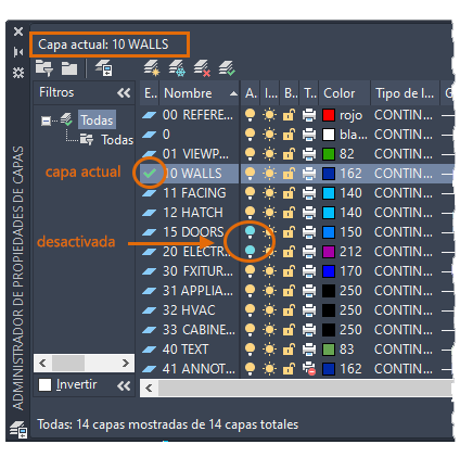 Las capas organizan el dibujo, lo que le permite suprimir temporalmente la visualización de los datos gráficos que no se necesiten. También puede asignar las propiedades por defecto, como el color y el tipo de línea, a cada capa.
