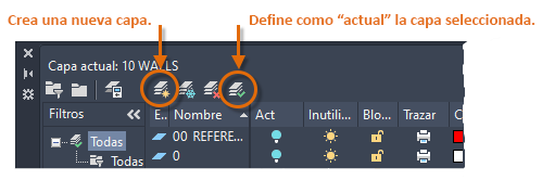 Para crear una nueva capa, haga clic en el botón que se muestra y escriba el nombre de la nueva capa. Para convertir una capa diferente en la actual, haga clic en la capa y, a continuación, haga clic en el botón indicado.
