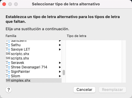 Si no se especifica un tipo de letra alternativo, cuando se abre un dibujo con tipos de letra que no se pueden encontrar, aparece un cuadro de diálogo que permite especificar el tipo de letra que se debe usar para cada tipo de letra no encontrado.