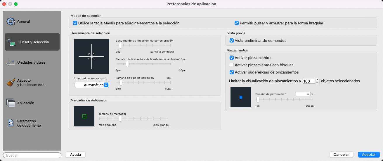 Controla el color del cursor en cruz, la apertura de referencia a objetos y la caja de selección en el área de dibujo. El color por defecto es Automático.
