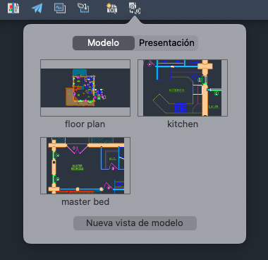 Si el espacio modelo está activo, al seleccionar cualquier vista guardada, se cambia a esa vista. Haga clic en Nueva vista de modelo para crear una vista y añadirla a la galería de vistas.
