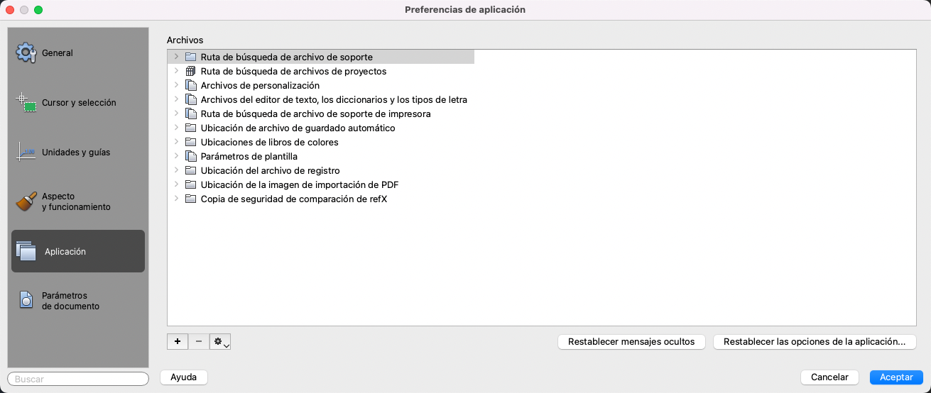 Presenta una lista de las carpetas en las que el programa busca los archivos de soporte, controladores, menús y otros archivos. Asimismo, muestra parámetros opcionales definidos por el usuario, como el diccionario que se va a utilizar para revisar la ortografía.
