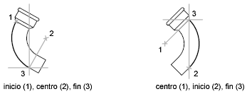 La distancia entre el punto inicial y el centro determina el radio. El punto final lo determina una línea que parte del centro y pasa a través del tercer punto.