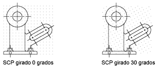 Si tiene que dibujar a lo largo de un alineamiento o ángulo determinado, puede cambiar el ángulo de rejilla y referencia girando el sistema de coordenadas personales (SCP). Este giro vuelve a alinear el cursor en cruz en la pantalla para coincidir con el nuevo ángulo. En la siguiente figura, el SCP se gira 30 grados para que coincida con el brazo del ancla.