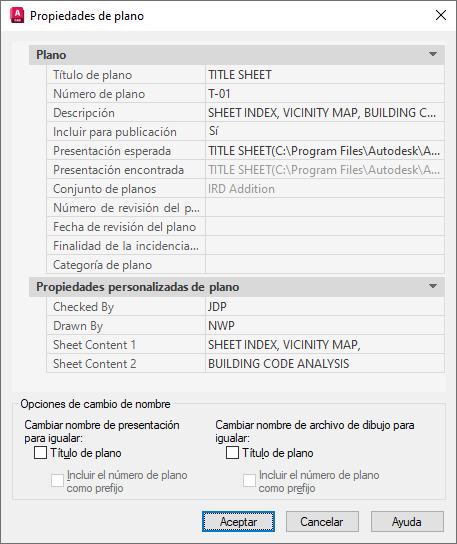 Muestra las propiedades del plano seleccionado. También muestra las propiedades personalizadas, si las hay. Puede escribir un nuevo valor para modificar cualquiera de las propiedades del plano. Presentación esperada es la ruta y el nombre de archivo del dibujo donde se guardó el plano. Presentación encontrada es la ruta y el nombre de archivo del dibujo donde se encontró el plano. Si las rutas son diferentes, puede modificar la ruta y el nombre de archivo en Presentación esperada. Esta operación vuelve a asociar el plano con el conjunto de planos.