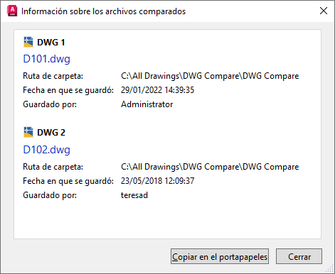 Este comando abre un cuadro de diálogo que muestra información sobre dos archivos de dibujo comparados. Hay opciones disponibles para crear un objeto de tabla con la información o para copiarla en el portapapeles.
