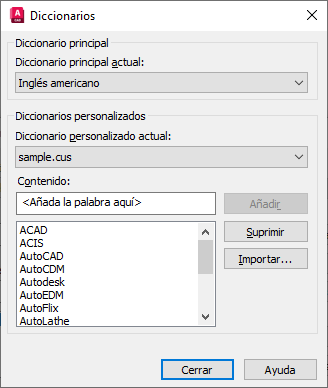 Administra los diccionarios. Durante la comprobación ortográfica, se establecen correspondencias entre las palabras del dibujo, las del diccionario principal en uso y los diccionarios personalizados actuales. Todas las excepciones ortográficas que se identifiquen con la opción Añadir se almacenan en el diccionario personalizado en uso.