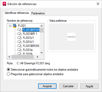 Para seleccionar la referencia que desea editar, designe un objeto de la referencia. Si designa un objeto que forma parte de una o más referencias anidadas, dichas referencias anidadas aparecerán en el cuadro de diálogo.