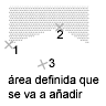 Designe puntos para definir un polígono (3). El área que se va a añadir se resaltará en verde. Pulse Intro. AREA calcula el área y el perímetro y devuelve el área total de las áreas definidas mediante la designación de puntos y objetos desde que se activó el modo Añadir.