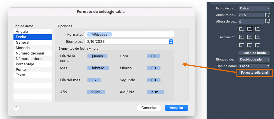 Se muestran diferentes opciones de formato en función del formato de datos seleccionado.