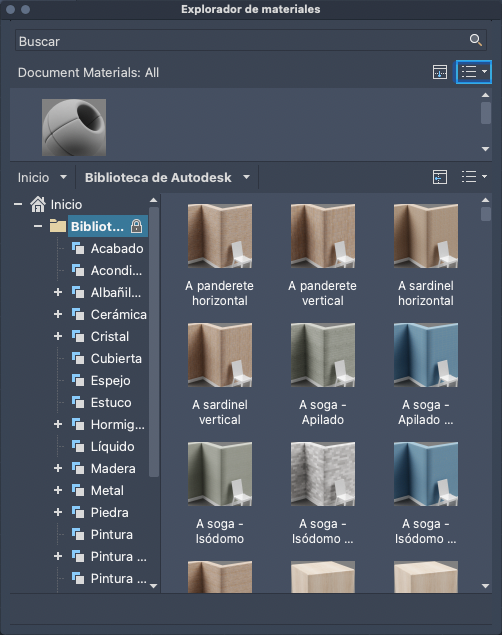 - Biblioteca de Autodesk. Muestra la biblioteca de Autodesk, que contiene los materiales predefinidos que se incluyen con el producto. También contiene un botón para controlar la visualización de bibliotecas y categorías de bibliotecas. Puede ordenar los materiales de la biblioteca por nombre, categoría, tipo y color.