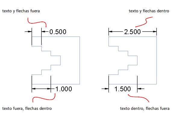 El texto y los extremos de cota aparecen normalmente entre las líneas de referencia cuando hay espacio suficiente. Se puede definir cómo se colocarán los elementos cuando haya limitación de espacio.