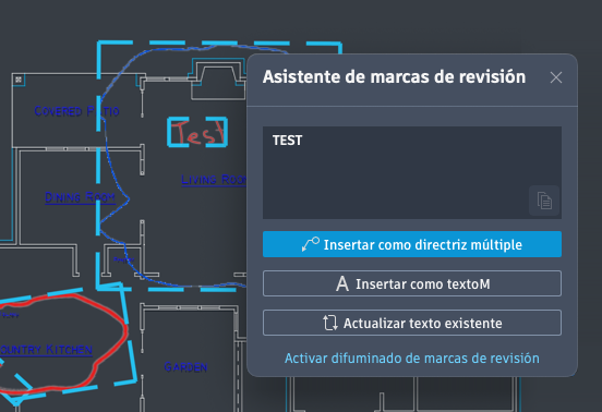 El Asistente de marcas de revisión identifica automáticamente las marcas de revisión como texto, directrices y nubes de revisión. Haga clic en una marca de revisión identificada y, a continuación, insértela como un objeto de textoM, directriz múltiple o nube de revisión. Puede editar el texto antes de insertarlo o copiar el texto en el portapapeles.