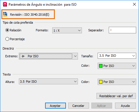 La nueva revisión se muestra en el cuadro de diálogo Parámetros de ángulo e inclinación para ISO.