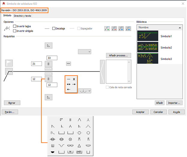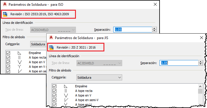 El cuadro de diálogo Parámetros de soldadura muestra las últimas revisiones de las normas ISO y JIS. Los símbolos de soldadura y de respaldo correspondientes también se enumeran en el Filtro de símbolo.