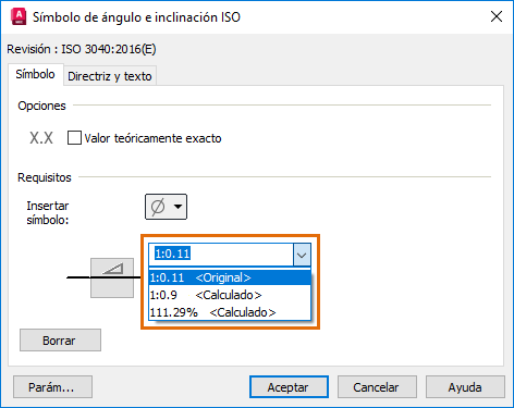 En versiones anteriores de AutoCAD Mechanical, el símbolo de ángulo e inclinación calcula automáticamente el ángulo de ángulo o inclinación de un objeto e inserta un único símbolo. Puede insertar el símbolo con o sin el cálculo del ángulo de ángulo o inclinación de los objetos seleccionados. Una vez modificado el objeto de ángulo o inclinación, el cálculo no se actualiza. Tampoco hay ninguna indicación de que el símbolo asociado es el valor calculado correcto.