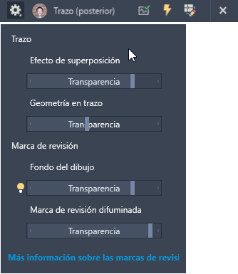 Marca de revisión difuminada. Cuando una marca de revisión digital está activa, controla la transparencia de las marcas de revisión difuminadas. Cuanto menor sea el número, más visible será la marca de revisión. El control deslizante Marca de revisión difuminada modifica la variable de sistema TRACEMARKUPFADECTL.